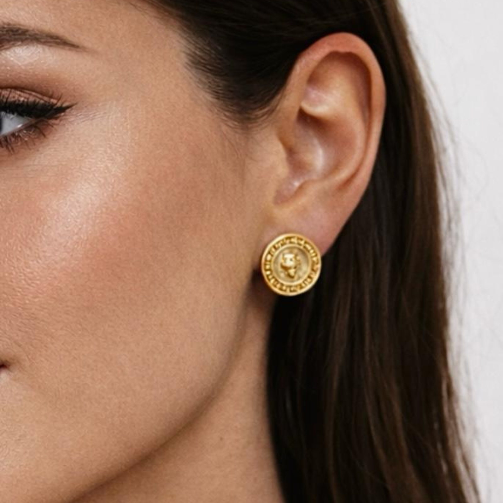 Gold-plated Greek coin earrings on a Svietlana by Colibra stud from the Olimpia collection. Earring diameter 1.8 cm.