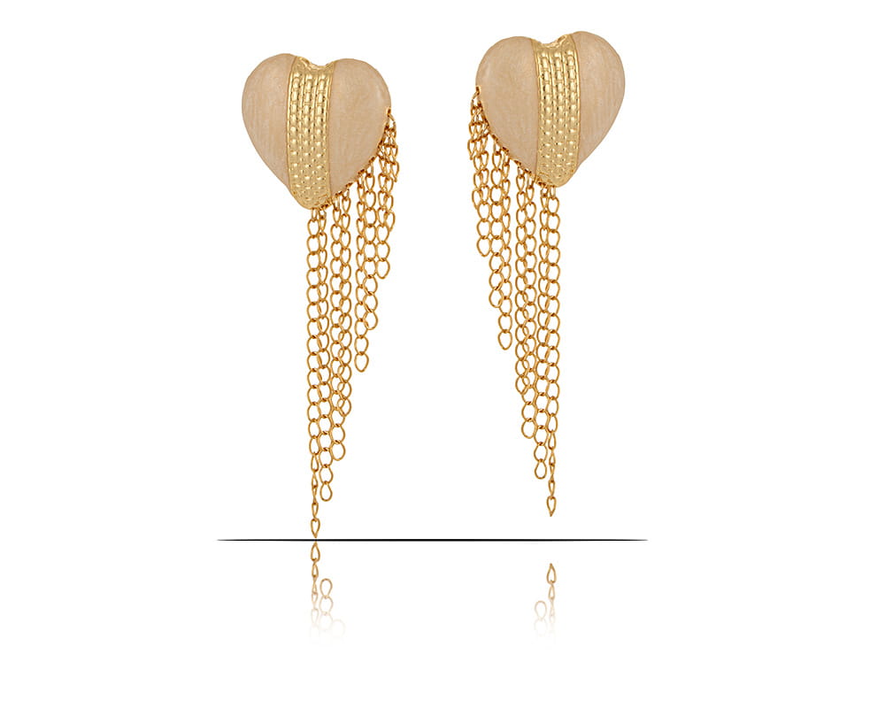 Gold-plated large heart earrings with chains, hand-painted with pearl enamel. Heart size 4 cm / 3.5 cm. Total earring length approx 12.5 cm.