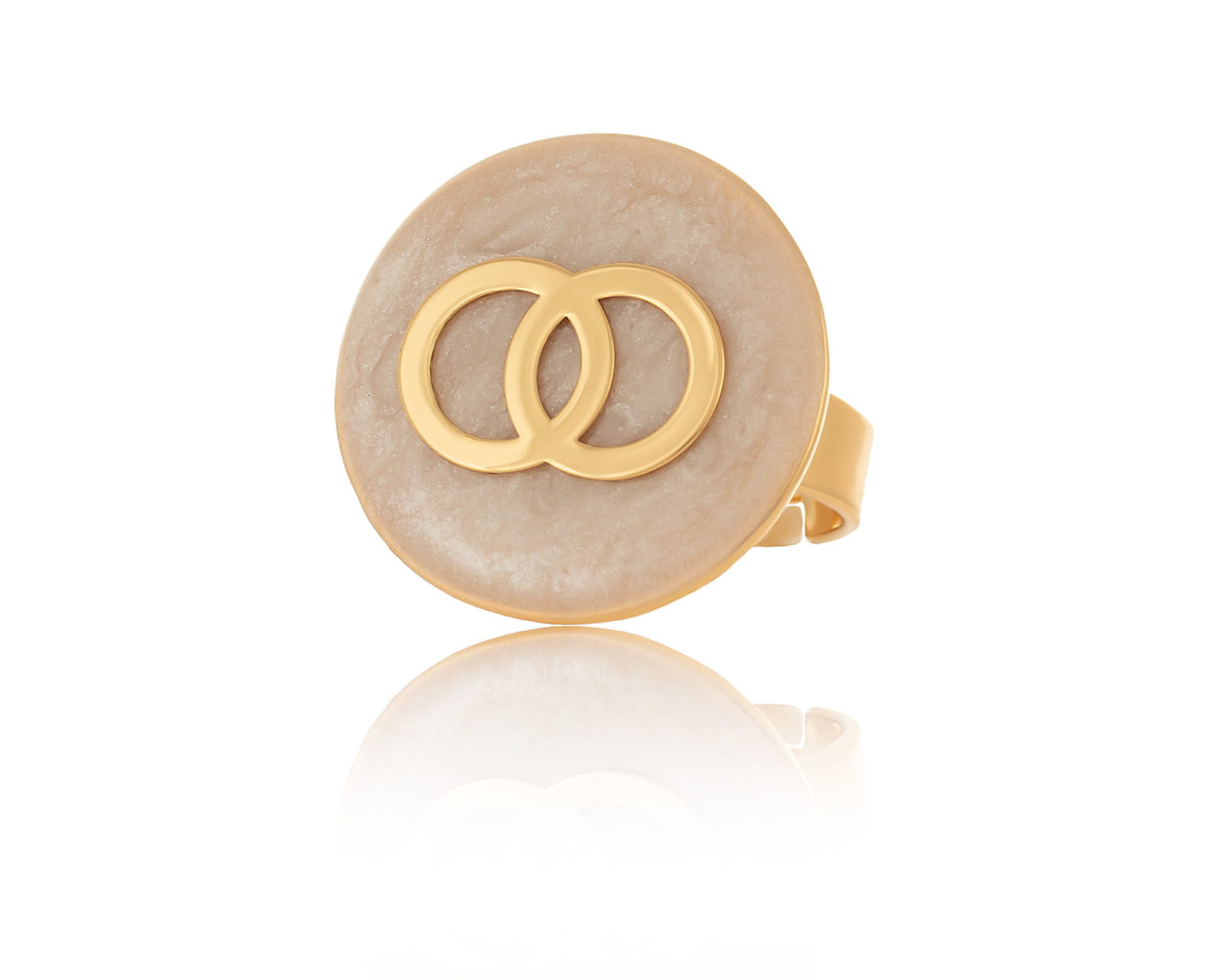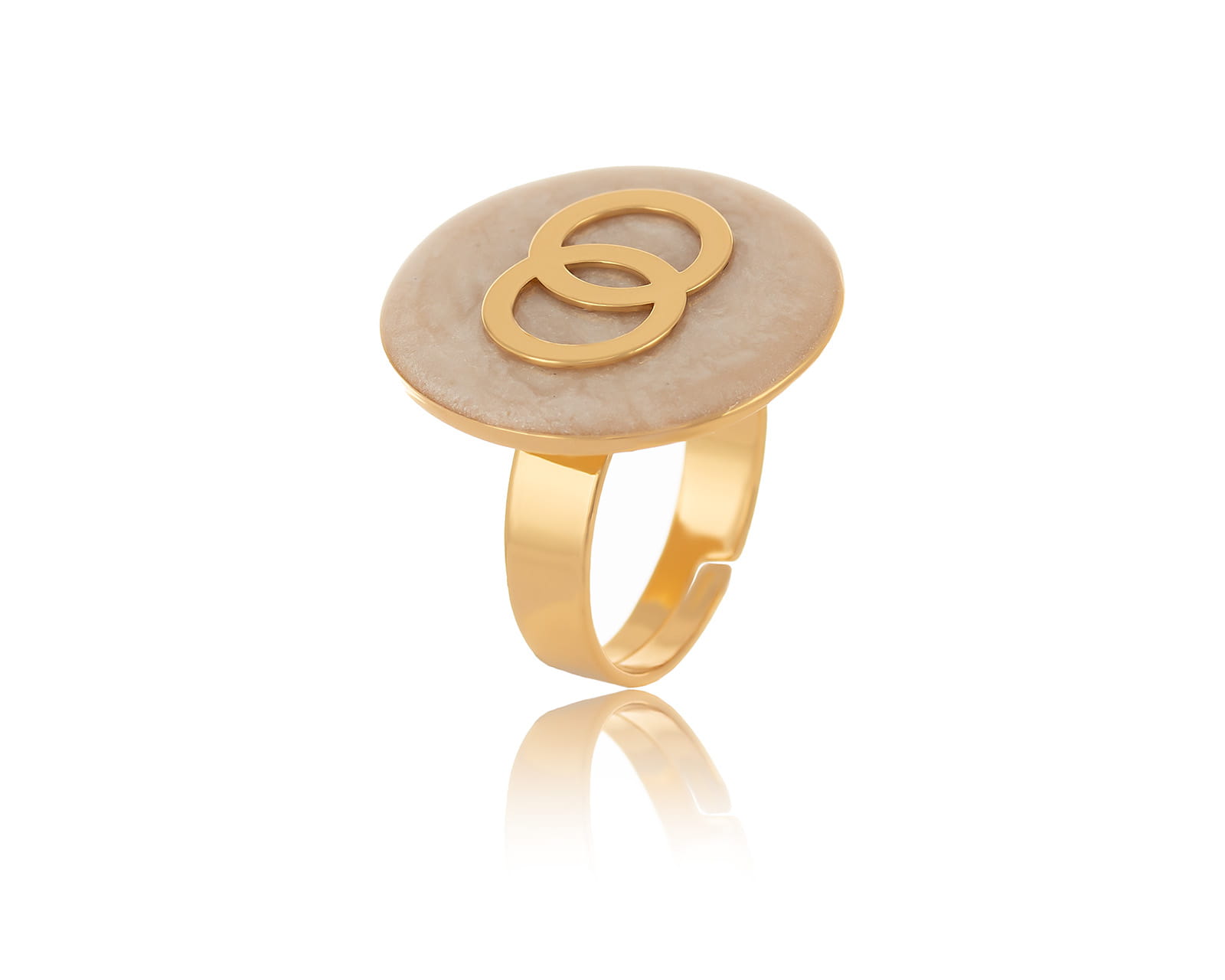 Gold-plated, adjustable ring with hand-painted pearl disc with little circles inside. Diameter of the disc approximately 2.2 cm.