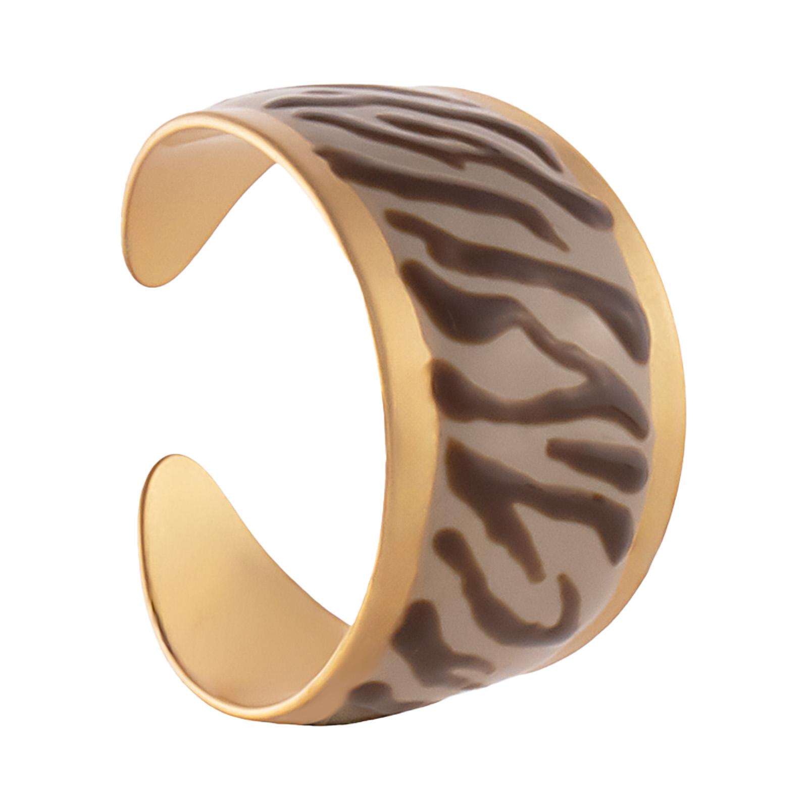 Unikatowa obrączka o szerokim fasonie, utrzymana w beżowej kolorystyce z efektownym wzorem w czekoladową zeberkę.