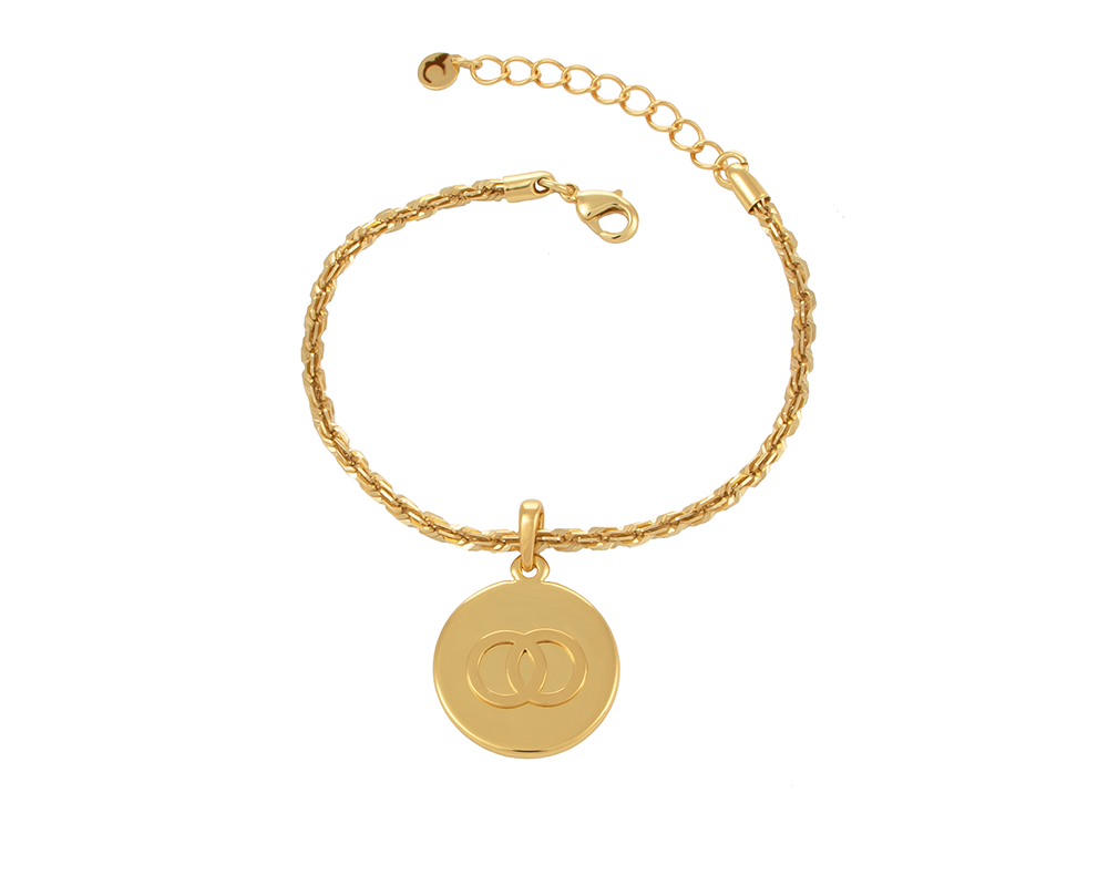 Pozłacana bransoletka z plasterkiem i kółeczkami. Długość bransoletki 18 cm + 4 cm przedłużki. Średnica plasterka 2,3 cm.