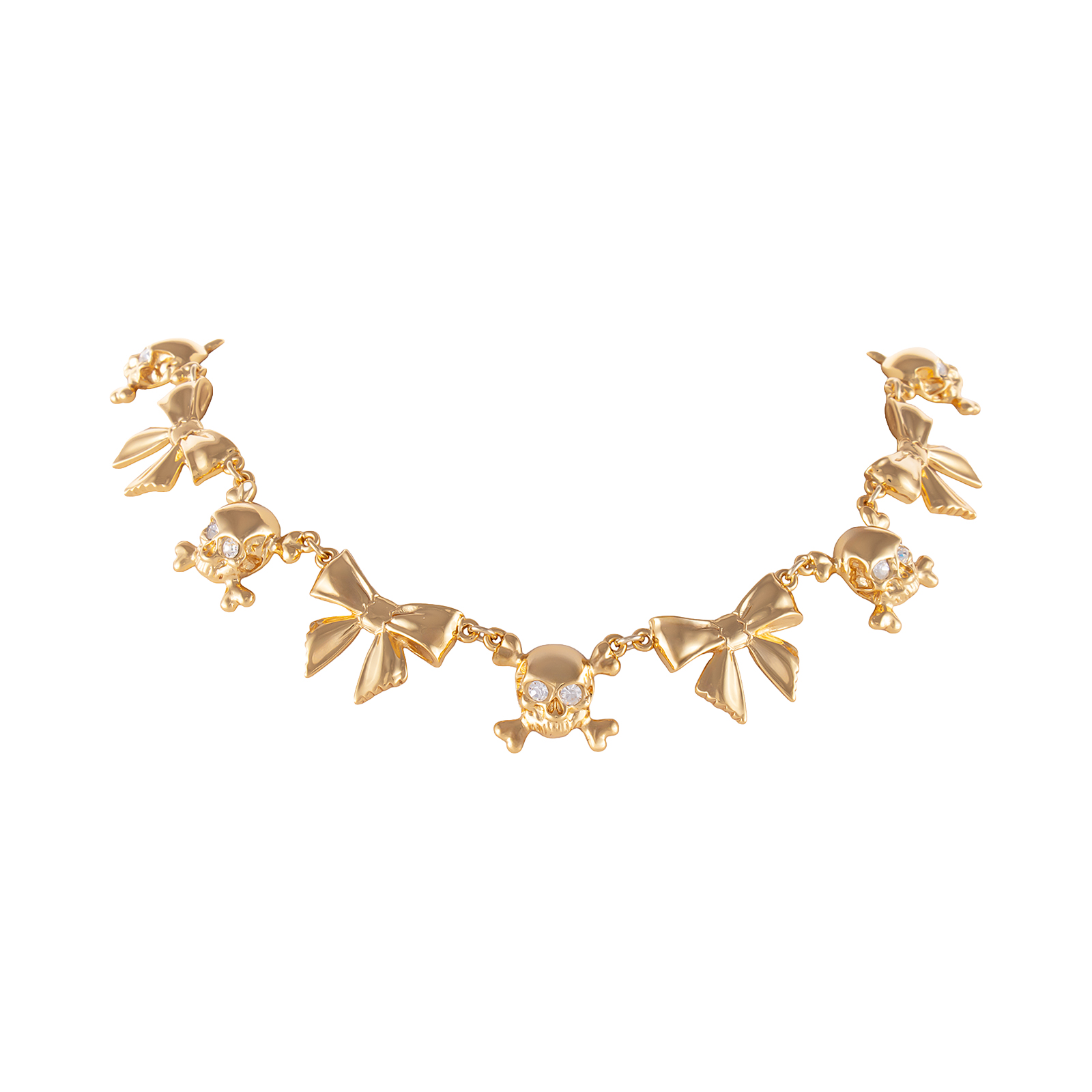 Naszyjnik zdobią subtelne czaszki i kokardki, które tworzą intrygujący kontrast z błyszczącymi kryształkami.