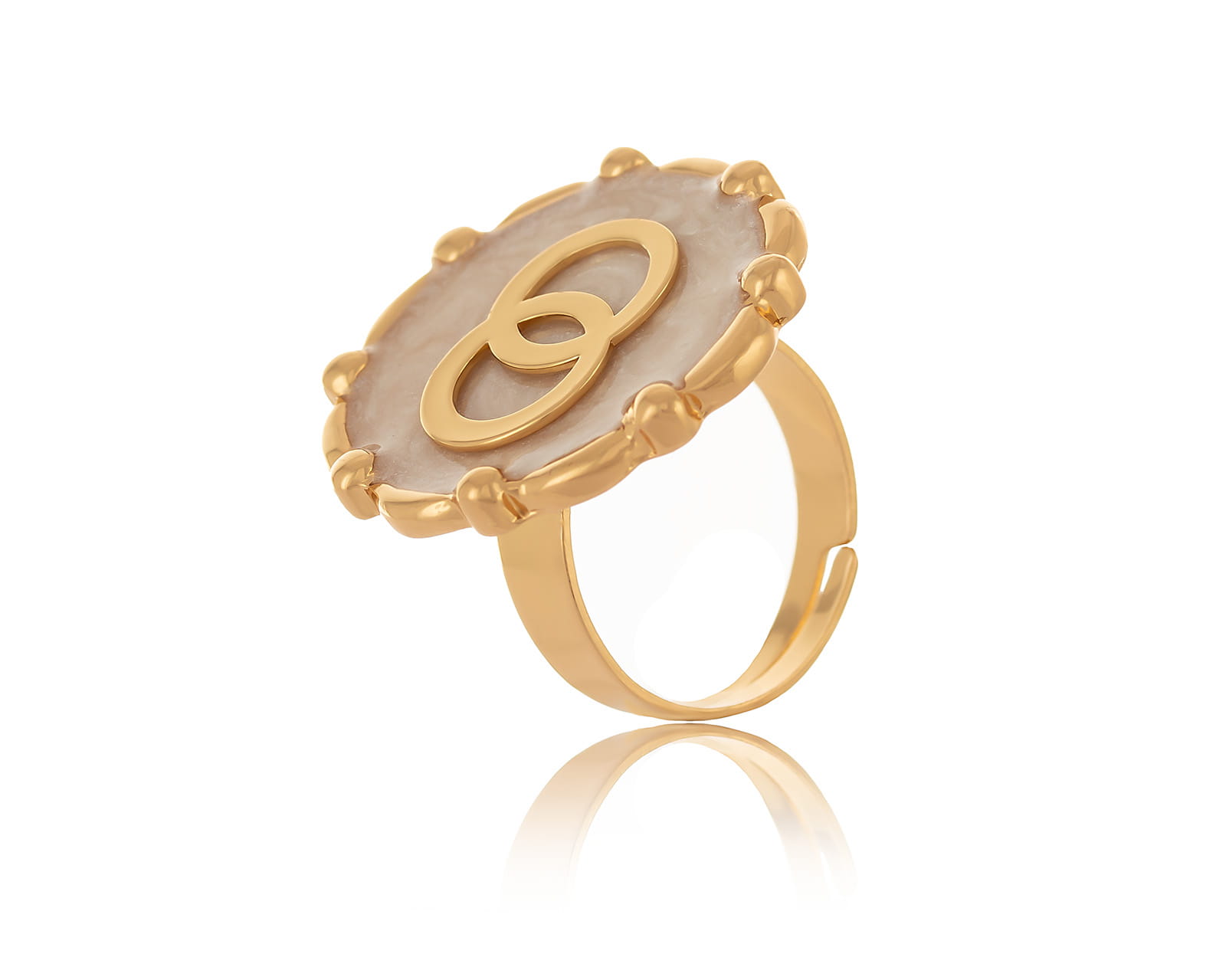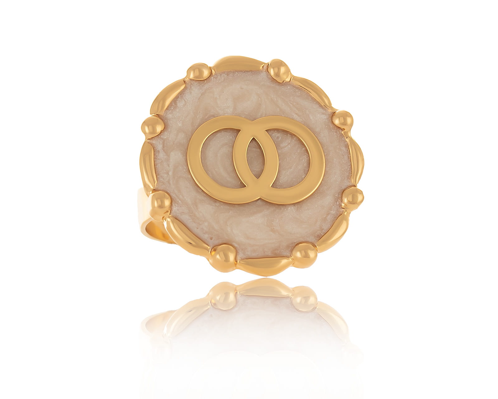 Pozłacany, ręcznie malowany na perłowo pierścionek z kółkami w środku.