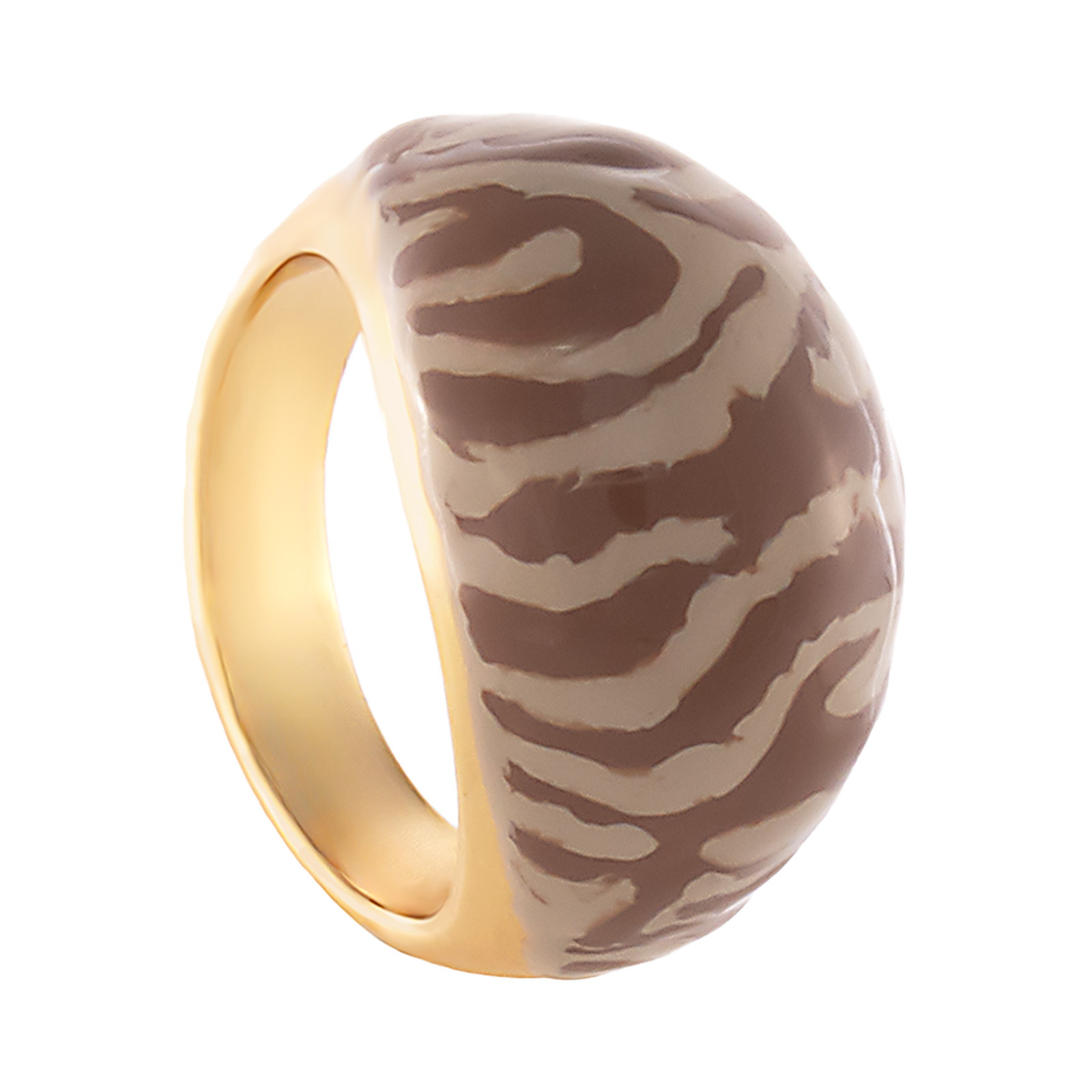 Elegancki i wyrazisty pierścionek o szerokiej, wypukłej formie. Wzór w czekoladową zebrę nadaje mu niebanalnego charakteru, łącząc klasykę z nutą egzotyki.